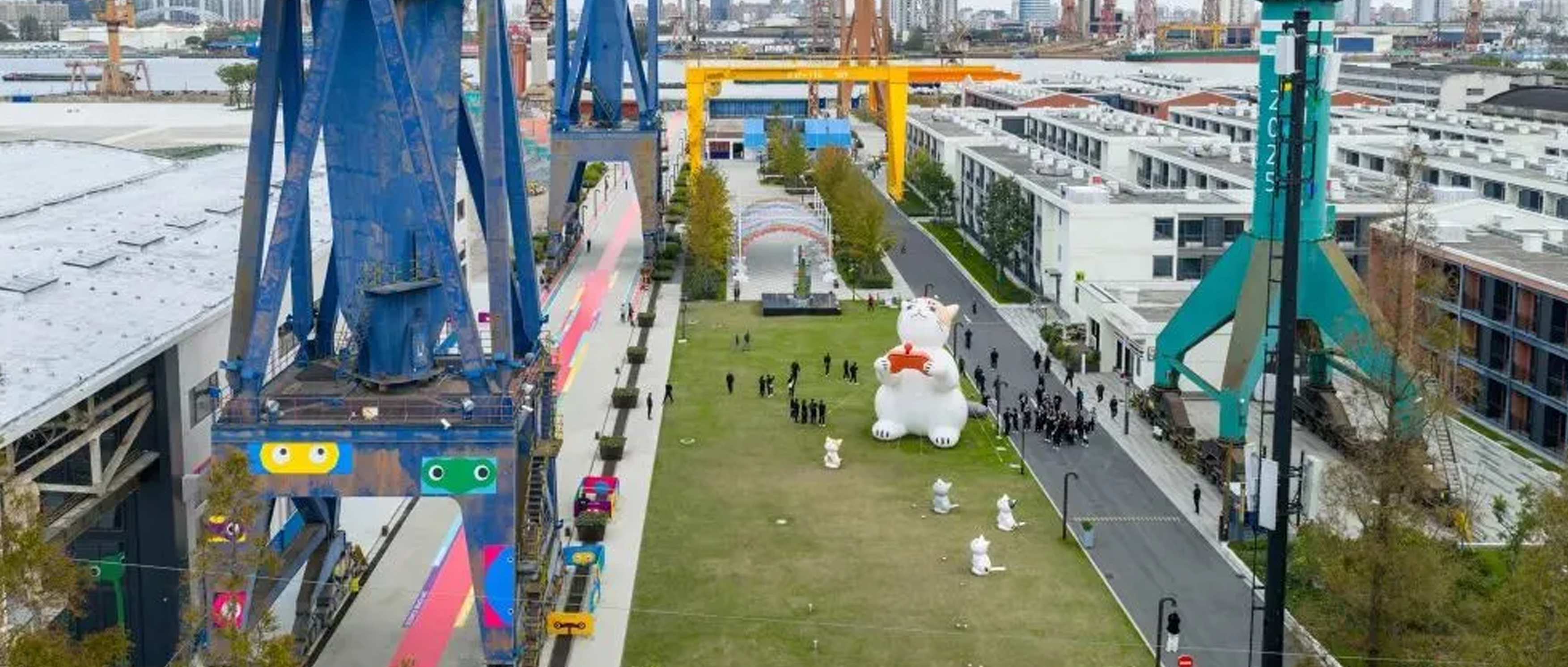 同年下半年,复兴岛被选为上海城市空间艺术季(SUSAS)主展区,“量子城市·复兴未来”在岛内展开。船台公园与老厂房被直接转化为展场与夜游空间:近10 米高的巨型猫咪气膜设置在百年塔吊前,夜间光影覆盖机械骨架,数字艺术作品持续吸引人群停留、拍摄和二次传播。随后,音乐节、咖啡节、草坪演出等活动接连上岛,复兴岛从一次性事件现场,转入高频使用的公共空间。