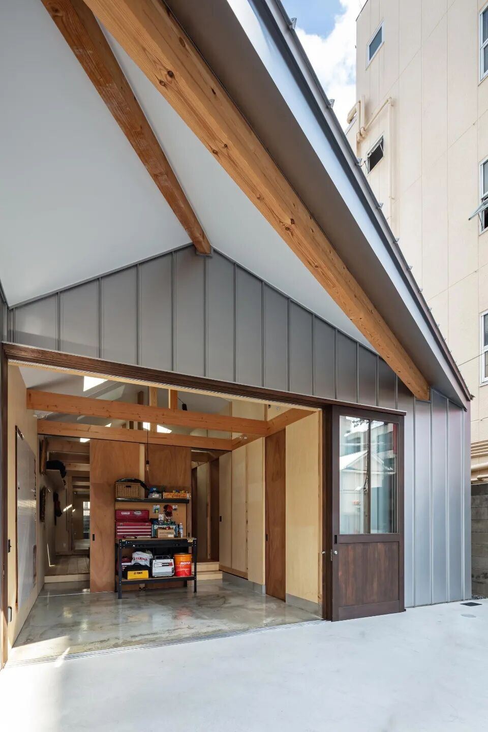 在这处狭窄的地基上建一个细长的单层住宅,便决定了屋内每一处空间都要最大化利用。就连门口也被设计成一个综合性的半户外空间,在摆放摩托车之外,还担负起卸货、开会等其他功能,整个住宅其实也肩负着住家、办公室、仓库三重功用,不愧是“工具箱之家”。