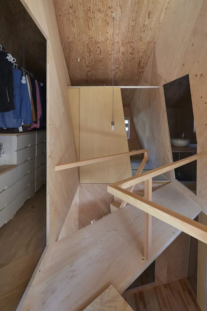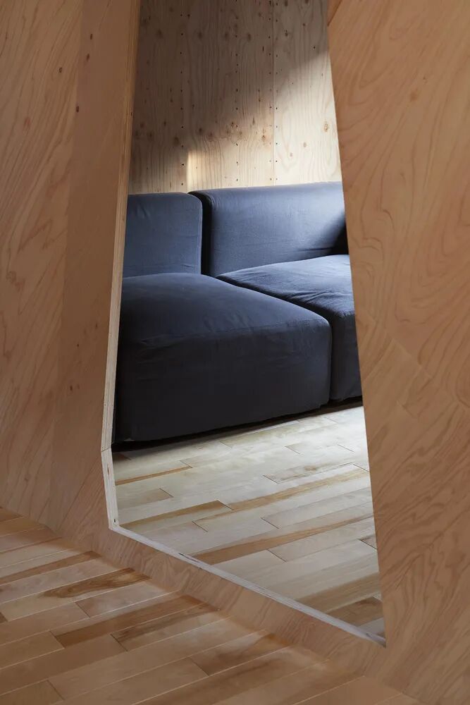 走进室内,不规则设计随处可见,这让狭小的空间里变化无穷,拥有更多可探索的地方。设计师用 24mm 胶合板把室内空间分为两个部分,一楼的客厅、门厅和二楼露台与外部环境距离更近,用作公共空间,剩下的区域则更私密,满足日常生活需求。