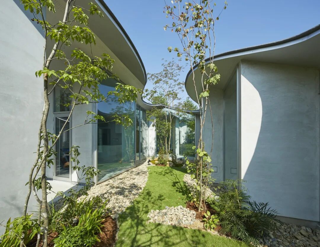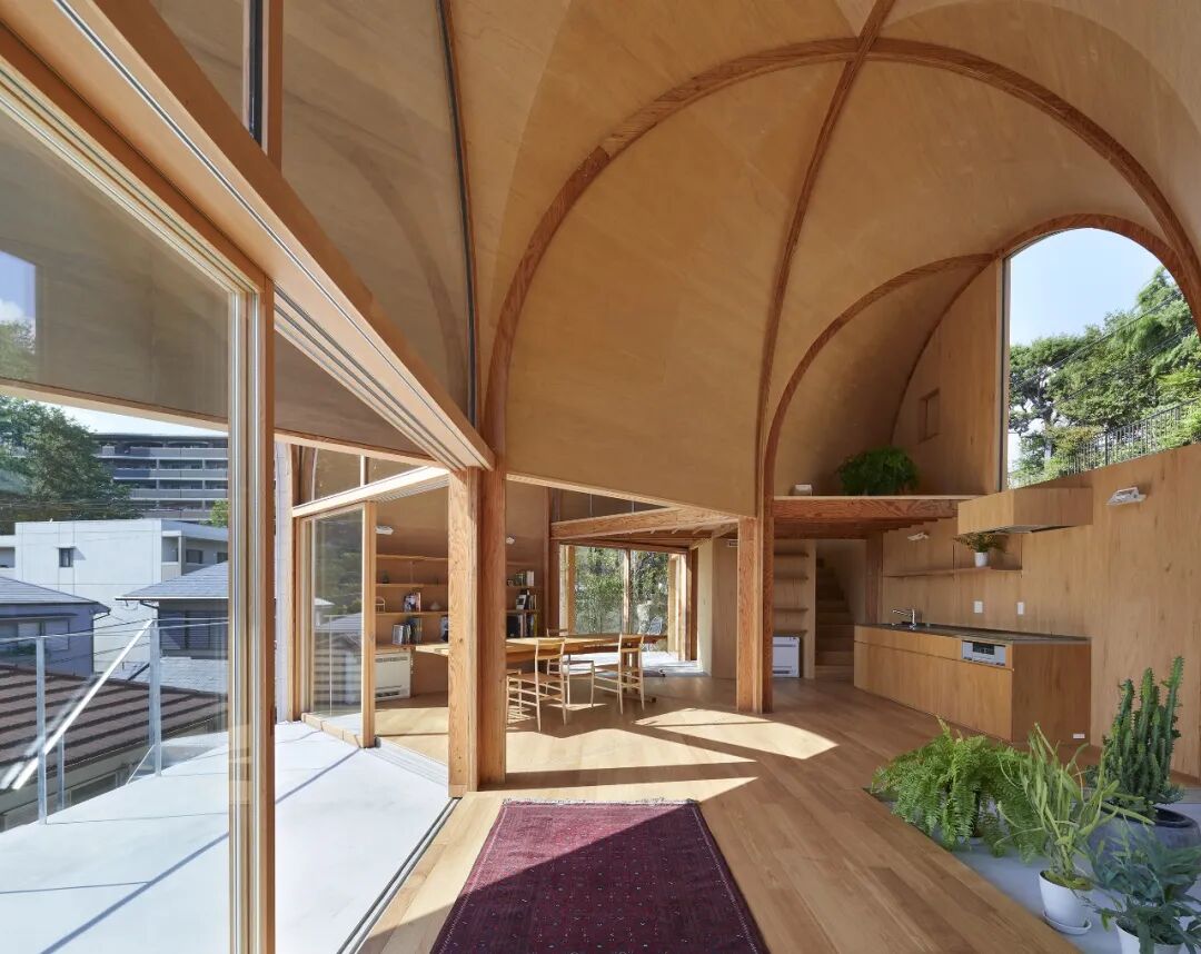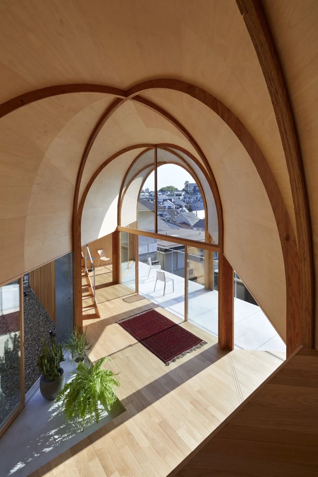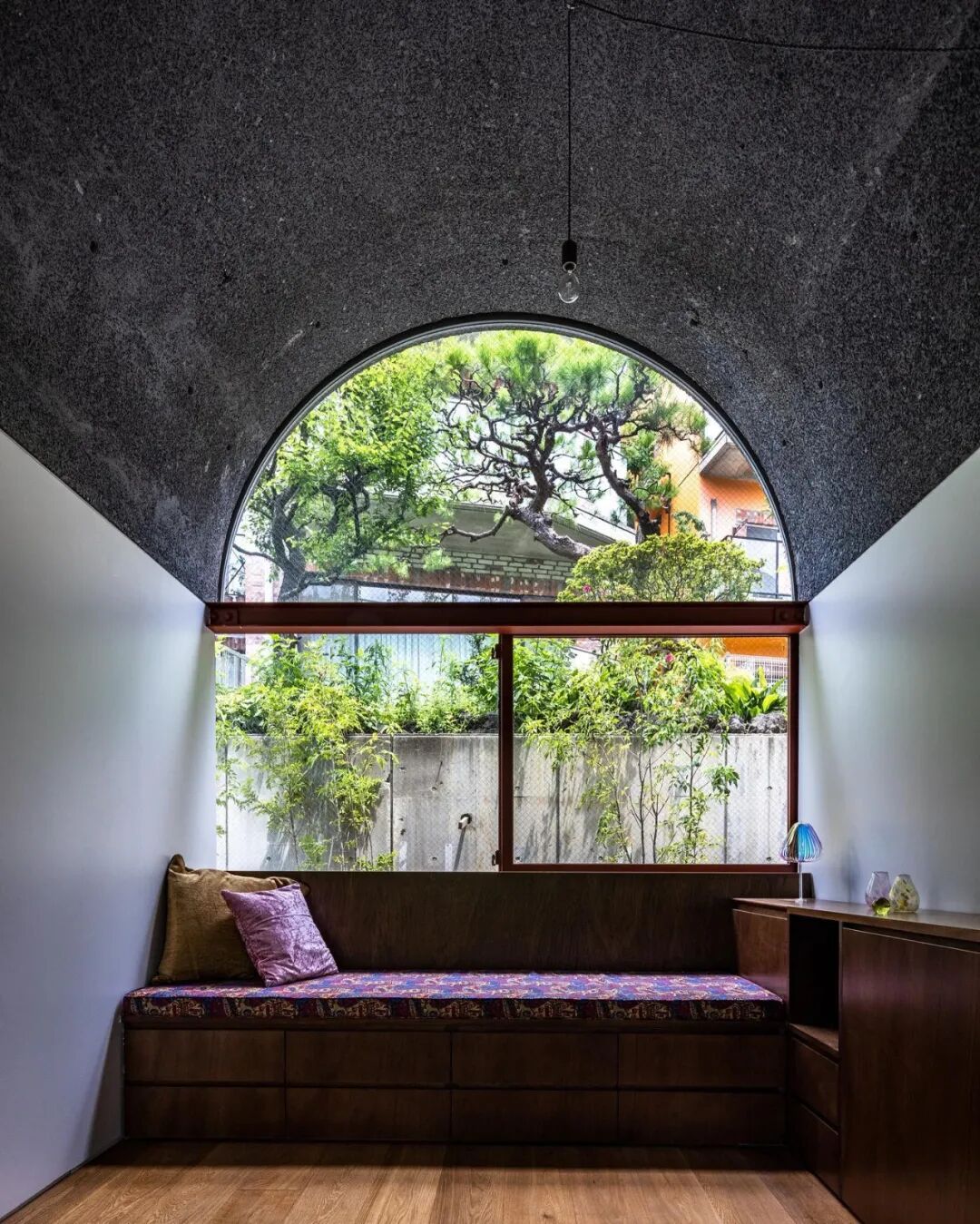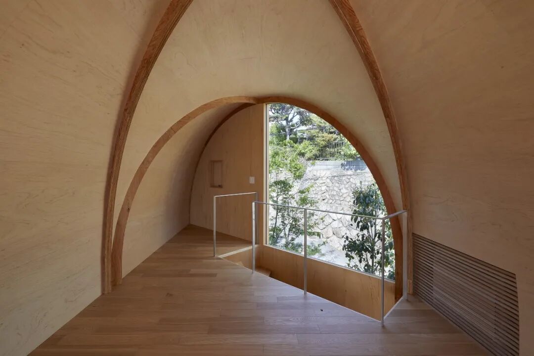 值得一提的是,整个住宅的外立面材料选择和拱形设计都出于运输困难的影响,因为住宅附近都是仅宽 2 米的蜿蜒小道。即便如此,畑友洋建筑设计事务所依然交出了意料之外的高分答卷。