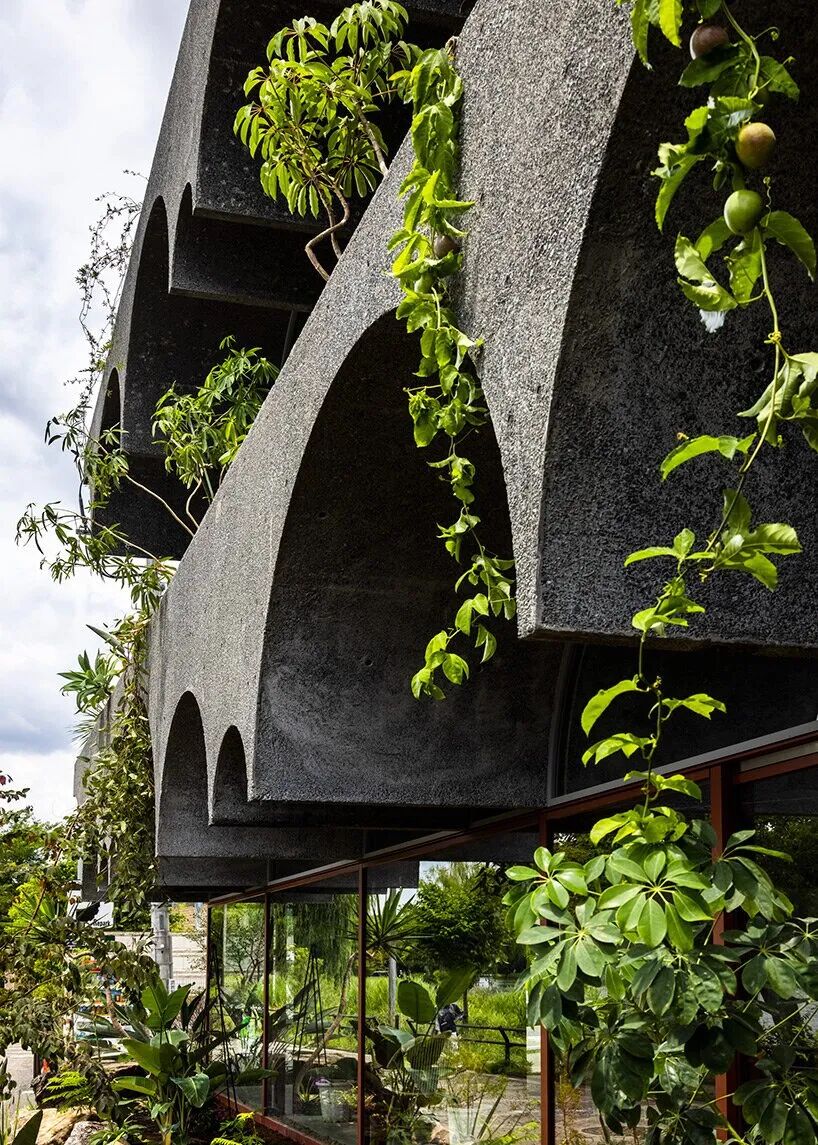 从空中俯瞰,一目了然,这栋灰色房子拥有一个白色屋顶,其中一半是镂空的白色铝制百叶窗,在阳光照射下,半室内空间也有户外花园的视觉感。