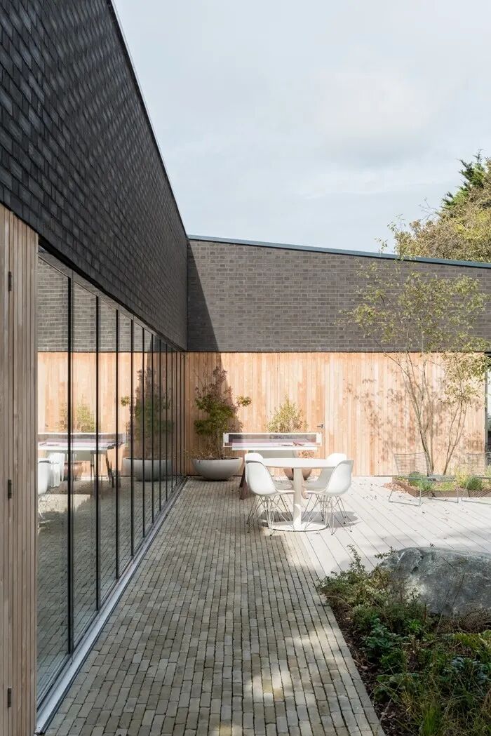 这座新房的设计运用简单的单层砌砖形体,单坡野花覆盖屋顶,环绕着风景优美的庭院空间。