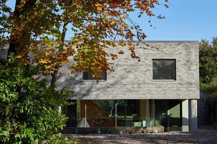正面的立面经过精心设计,上层手工砌筑的砖砌有细化的挤压水平方向。这跨越了一个通往底层的宽阔开口,让人们可以穿过房子看到远处花园的景色。