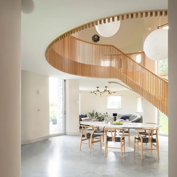 当代酿酒屋(the Modern Oast) 是一座新建的房子,形体基于用于干燥啤酒花的当地建筑形式。这所房子可容纳一个有两个年幼孩子的家庭。每个圆形装饰物在家居装饰中都发挥着不同的作用。一个三层高的中央圆形连接所有空间,厨房和客厅与底层的这个空间相连,还有一个备用卧室、书房、浴室和杂物间。在一楼,一个双高客厅和弯曲的楼梯平台提供了通往三间卧室的通道,这些卧室位于剩下的三个圆形中。