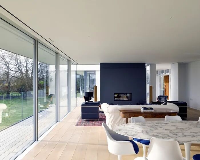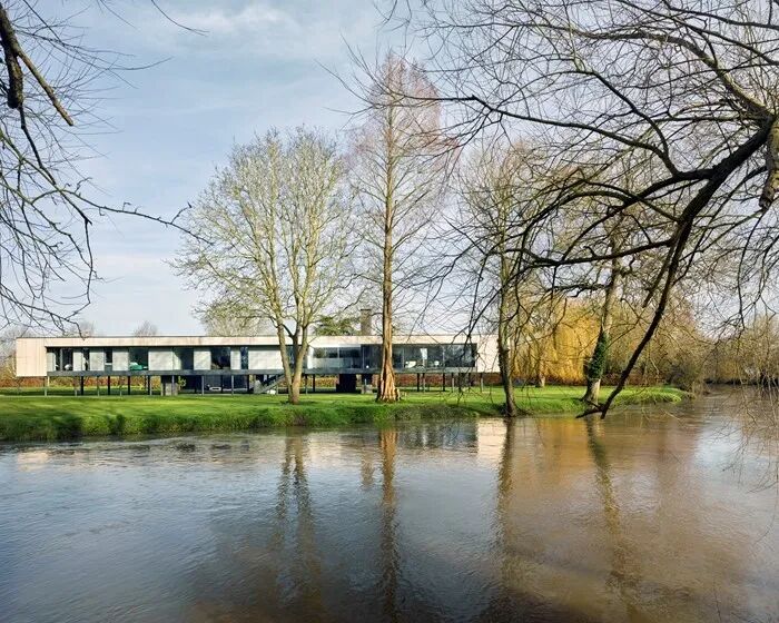 河边住宅(River House) 坐落在泰晤士河拐弯处的一块令人惊叹的地块上。从一条长长的私人道路进入,该地块位于洪水区 ,定期洪水达 1.2m。为了提醒这一点,房子的地下室展示了一艘小艇。