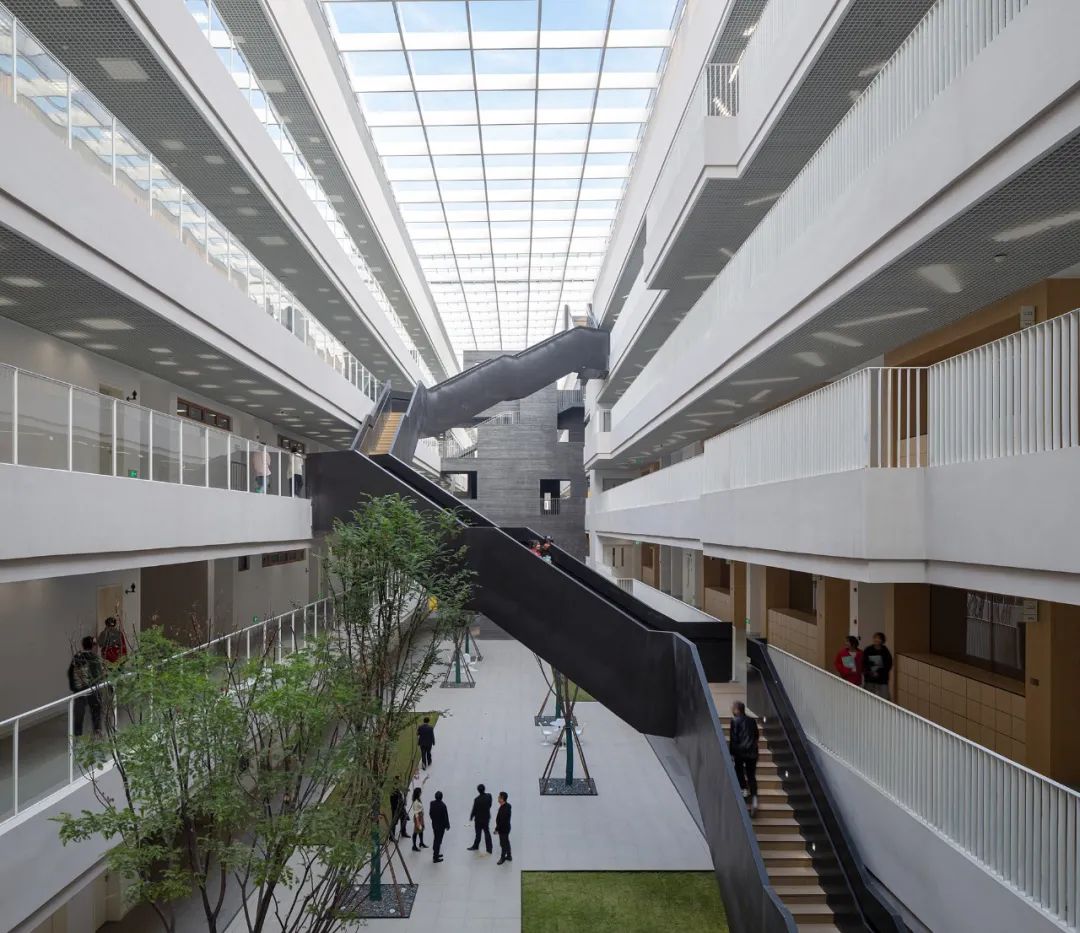 教学楼尽管功能布置十分紧凑,但并不封闭。利用建筑体量局部打开的洞口,结合公共楼梯垂直交通设施的置入,朝向校园与城市开放。
