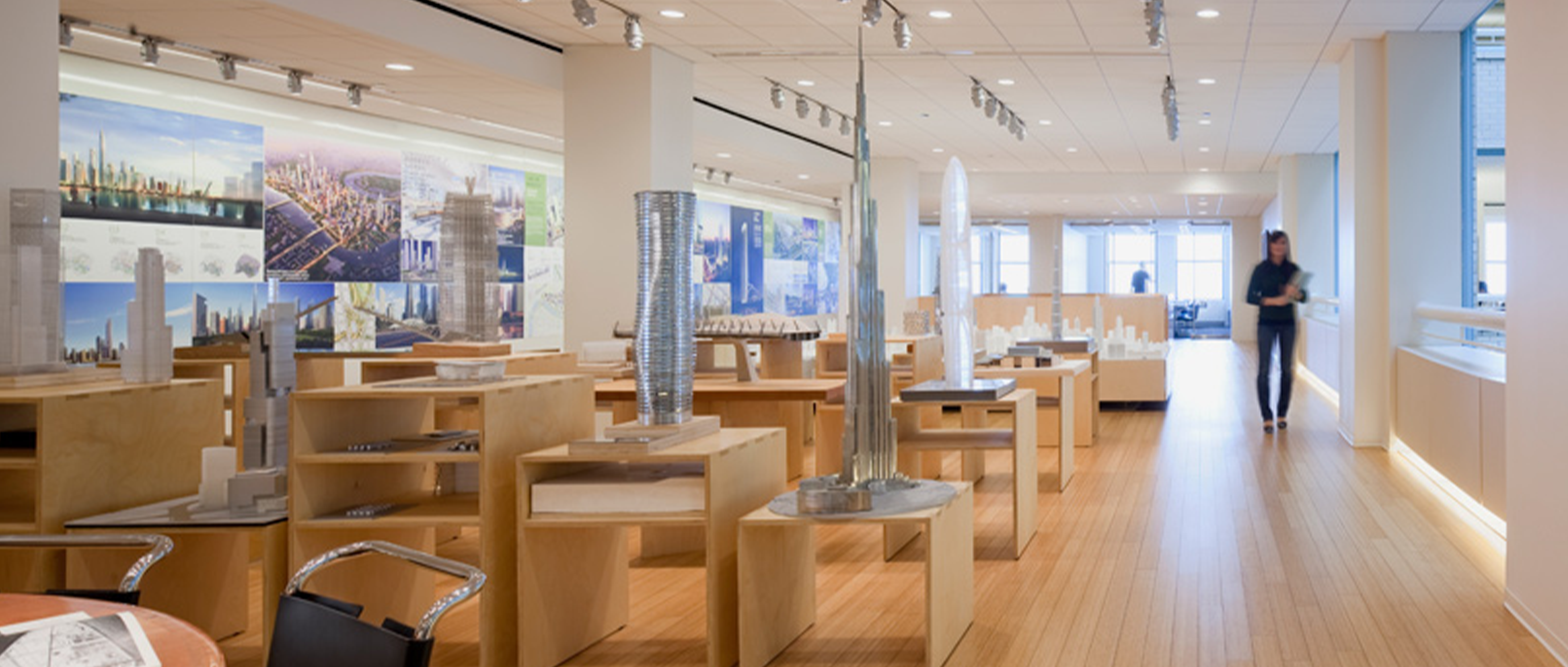 纽约办公室现位于华尔街,占据两层,带有model room和展览模型的地方以及小的图书馆。因为纽约办公室一直在扩大,加之办公室有一定区域要用于项目展览,所以会显得有一些拥挤。不过SOM将要搬去新的办公室——SOM设计的世贸大楼7号楼,会有更大的共享空间和展览空间以及material library,还有不同的有趣的讨论空间以及健身房,十分令人期待,希望在复工之后能给大家带来更多活力。