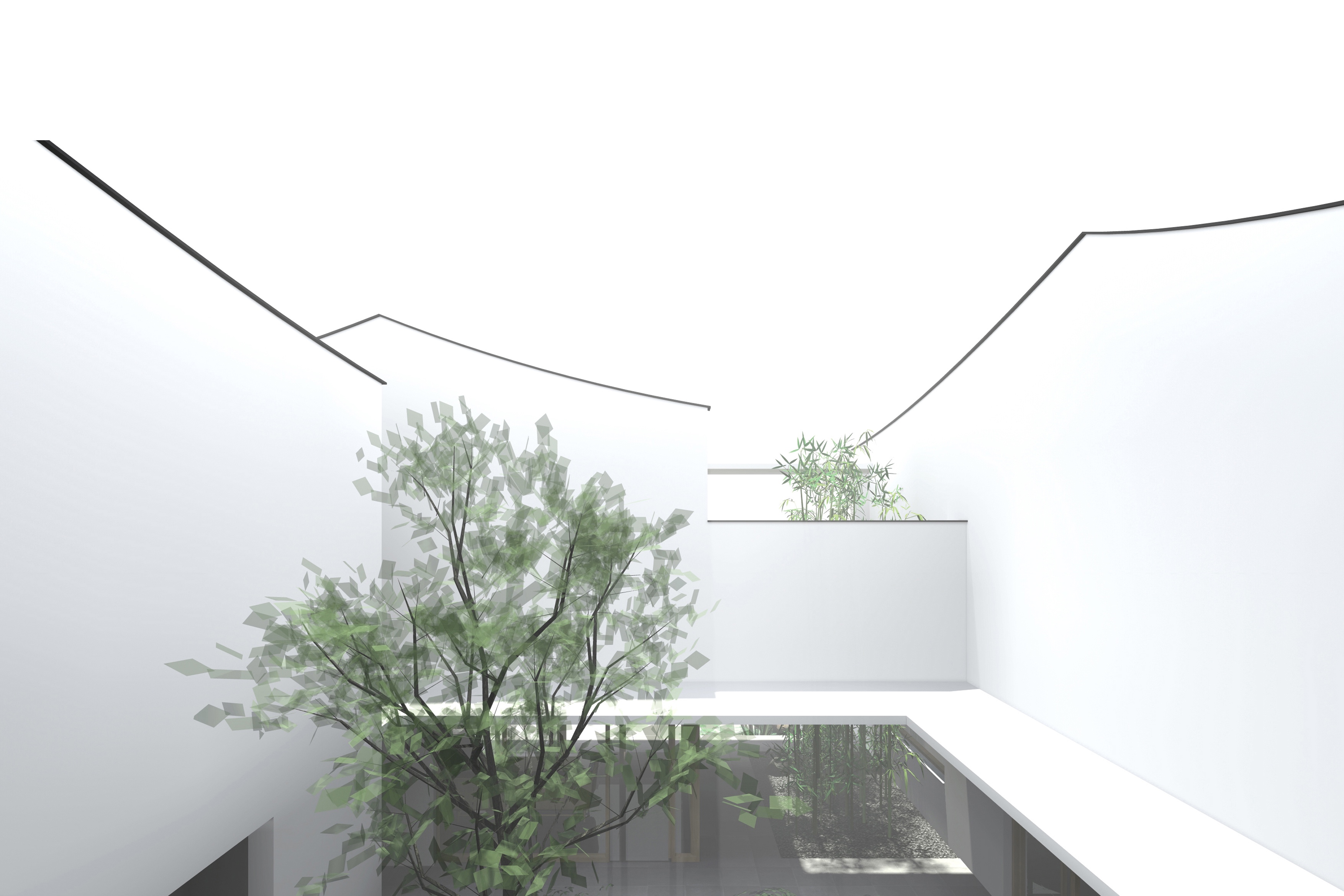 A corridor-bridge in the shape of polyline cross over the central space, dividing it into two parts, the main garden in the south and the inner garden in the north. The main garden as the public zone is more open, with the atelier on the east side facing the main salon in the west; the inner garden is more private, spaces expand circuitously to the north-east. The water of the garden is like Liu Garden, starting from the moon gate at the southmost end of the main garden, passing under the corridor-bridge, meandering inwards and finally hiding its end in a courtyard in the northeast of the site.