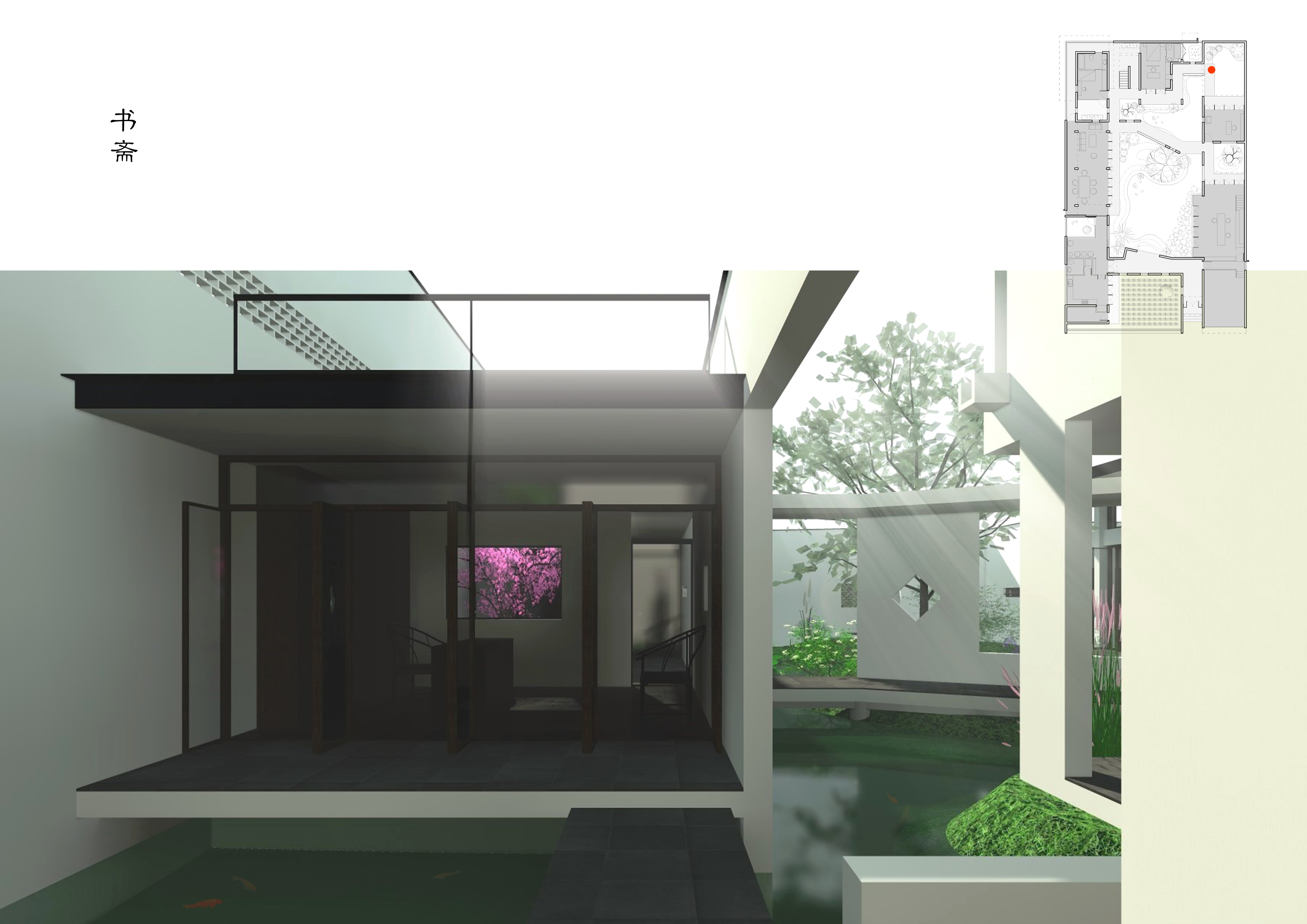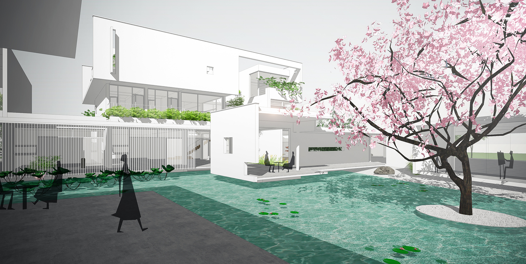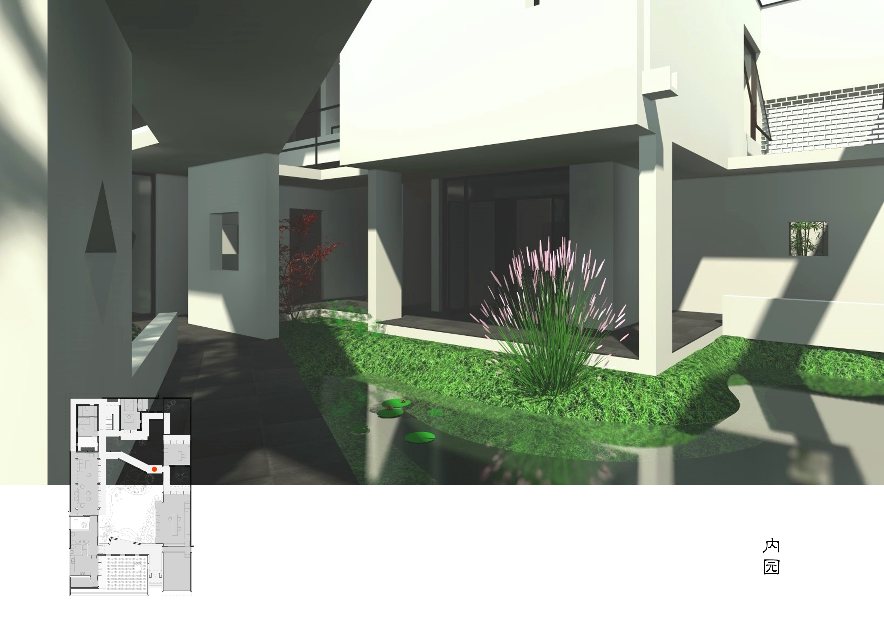 The border of the water garden is irregular providing full and varied surrounding façades, like Master of the Nets Garden. Walkways and corridors around water give experiences of promenade, repose and viewing. A pavilion is formed at the joint point of two corridors, floating lightly above the water, hiding the villa building in the north behind its back. The first floor of the east volume is a little art gallery, also used as an handcraft atelier, whose glass façade brings in the landscape of the orchard-field on the east of the site, gaining visual depth for the whole garden. Eight guestrooms are set on the second and third floor, viewing east.