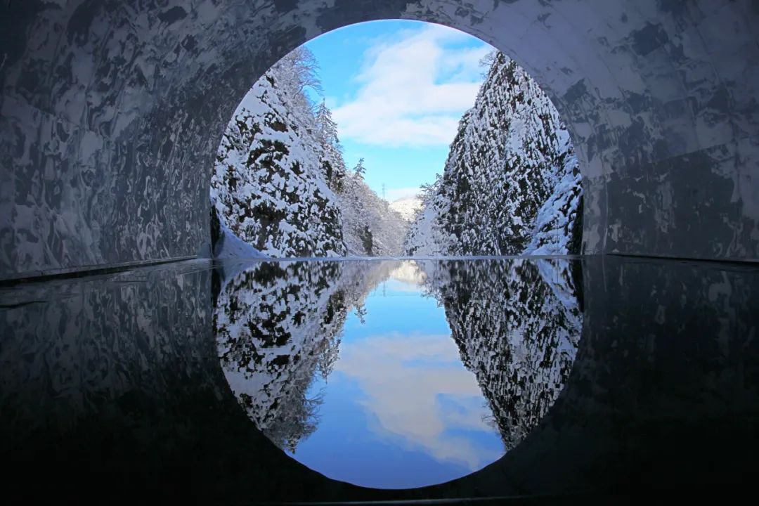 “光之隧道”全长750米,由“天河”入口—隧道—观景台组成。隧道穿行于清津峡六方石构成的峡谷岩壁中,尽头处的“镜池”,水面、镜面、自然融合,映射出隧道外四季的风景,表现出“虽由人作,宛自天开” 的美学意蕴。光、风、温泉和溪水、反射和色彩被融入设计之中,编织出整体的“旅程”。