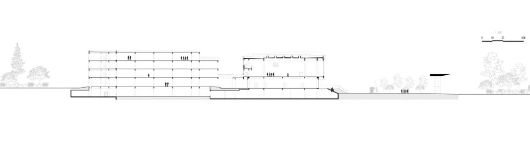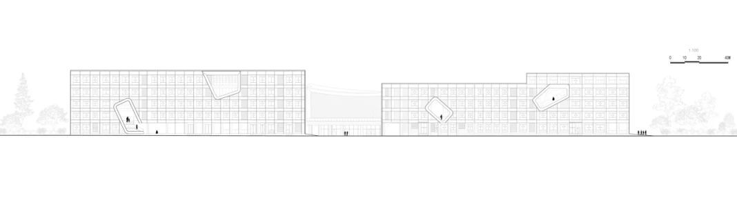 从西向东,数条支路串联起半围合的院落、下沉庭院和空中连廊,并连接至校园的文体活动中心,营造出起伏变化的空间体验。这些路径在引导动线的同时,也形成了多个尺度各异、层次丰富的交汇节点。