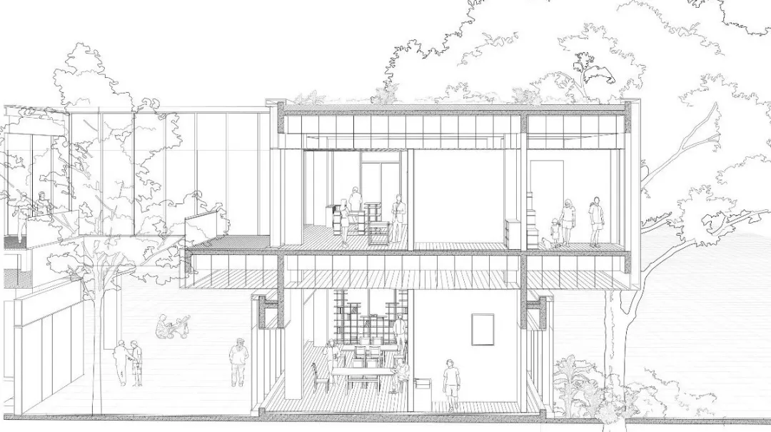 ▲ 二层的玻璃连廊和走廊阳台体系构成“兴趣环”Second-floor glass corridors and balcony systems forming an "interest loop"