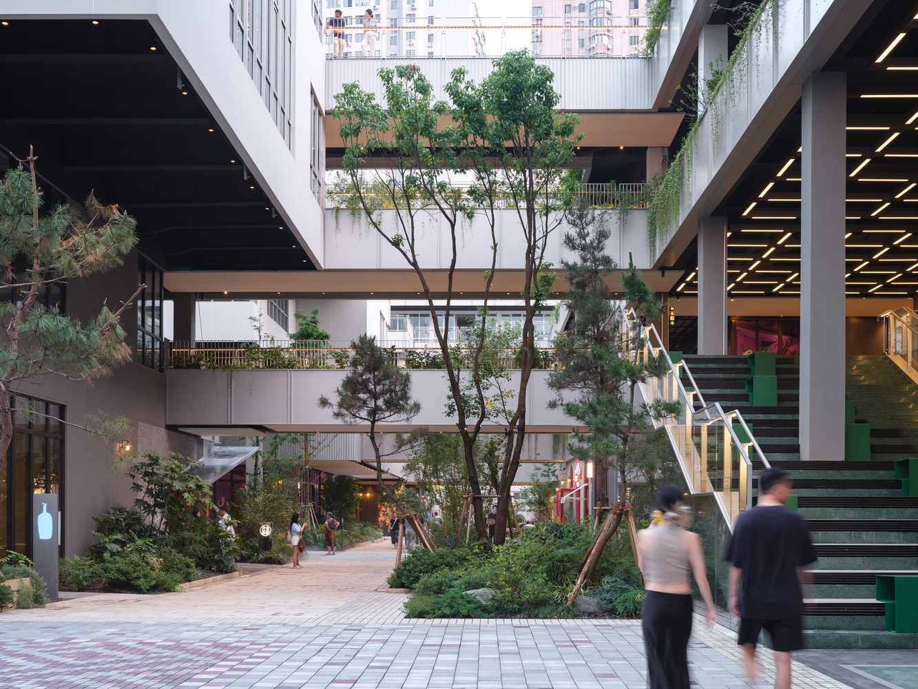 设计团队拆除部分外墙,同时整体构筑为通风的钢结构幕墙,形成无缝的室内外过渡休闲空间;室内则以自然生态与开放空间为特色,灵活布局,以“台阶文化”动线串联多元体验。户外还设置了屋顶花园、跑道等绿色空间,倡导健康生活方式,还原在自然中漫步的体验。