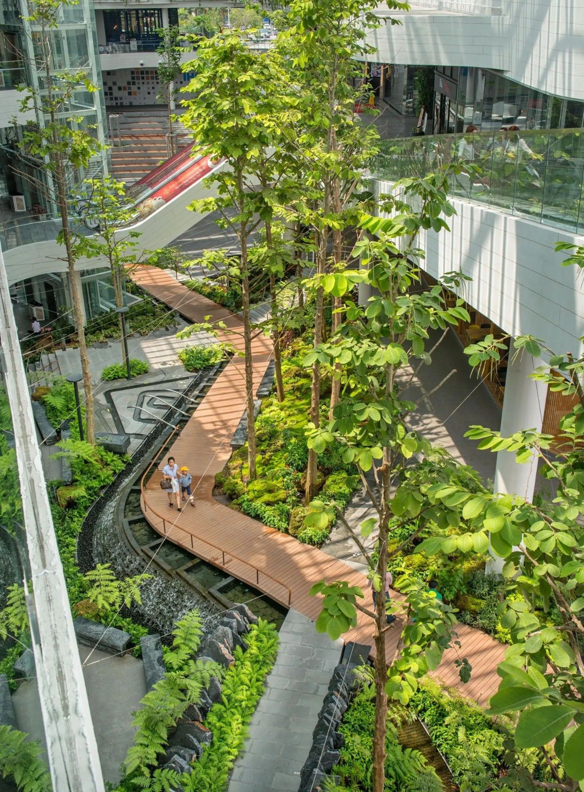 同样在曼谷的绿色商场Mega Bangna,以自然山谷为灵感,通过大量使用再生木材和天然石材,在设计过程中大幅减小了对环境的影响,同时通过高效的能源管理系统,大幅降低资源消耗,降低运营成本;在空间组织与动线设计上,Mega Bangna将自然景观与现代建筑元素融合,创造了类似于“登山”的购物体验,40万平方米的空间集结了450多个品牌,也是东南亚最大、最具有代表性的公园式商业综合体,多年来一直稳居亚洲目的地销售排名前列。