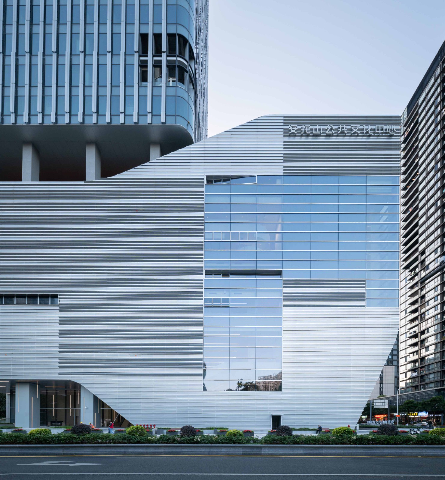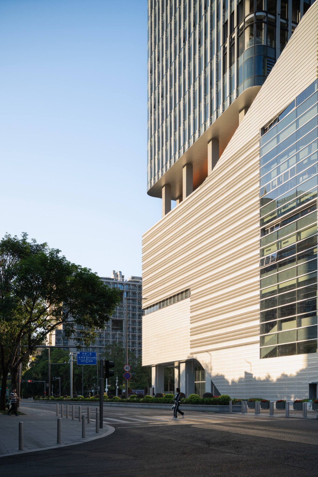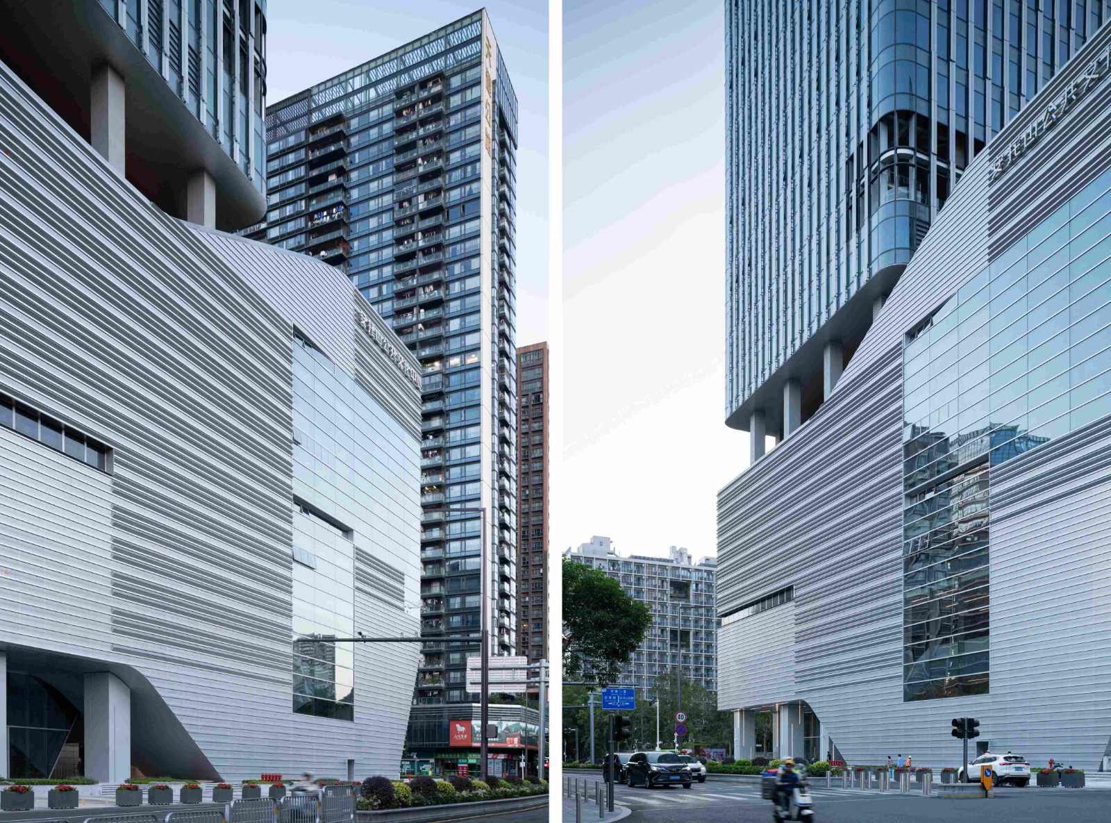 在材料与建构层面,设计也延续了“艺术山林”的叙事逻辑。裙房作为“山”的载体,其表皮系统历经多轮研究,最终选择通过直面与折面的银灰色穿孔铝板的拼贴肌理,形成如地质层理般富有张力与深度的肌理。