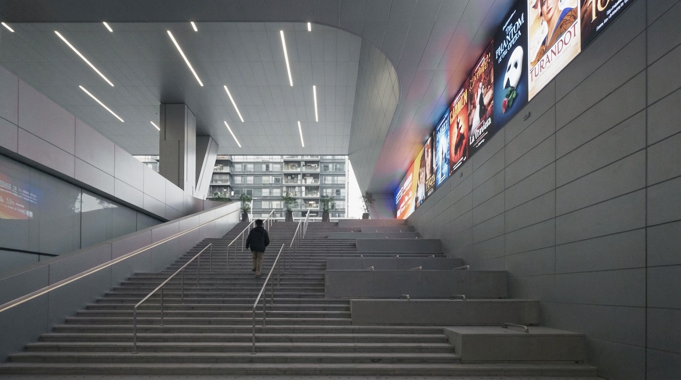 公共大厅直接衔接音乐厅、大剧院及黑匣子剧场,使不同场馆的观众在幕间休息时得以自然汇聚、交流,共享同一片充满艺术氛围的公共领域。交错、盘旋而上的楼梯不仅高效地串联起各层平台,其本身也成为观众驻足、观展、社交的场所。随着人的移动,空间景象持续变换,仿佛一场关于“攀登”与“发现”的静态演出。
